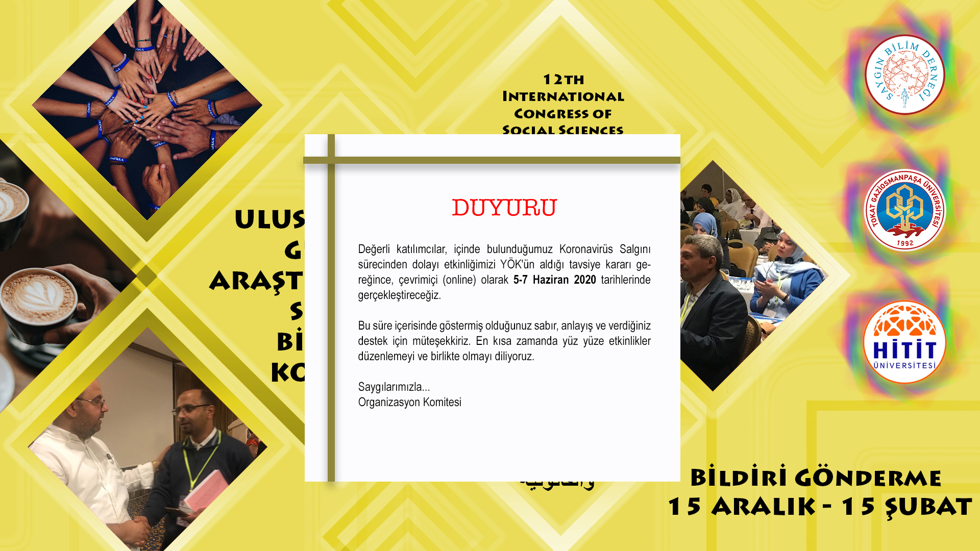 12. Uluslararası Güncel Araştırmalarla Sosyal Bilimler Kongresi, daha önceki kongrelerde elde edilen birikimin geliştirilmesi ve bilginin daha geniş çevrelere ulaştırılması için 05-07 Haziran 2020 tarihlerinde YÖK'ün tavsiye kararı gereğince çevrimiçi ortamda (online) gerçekleştirilecektir.